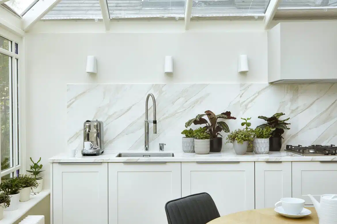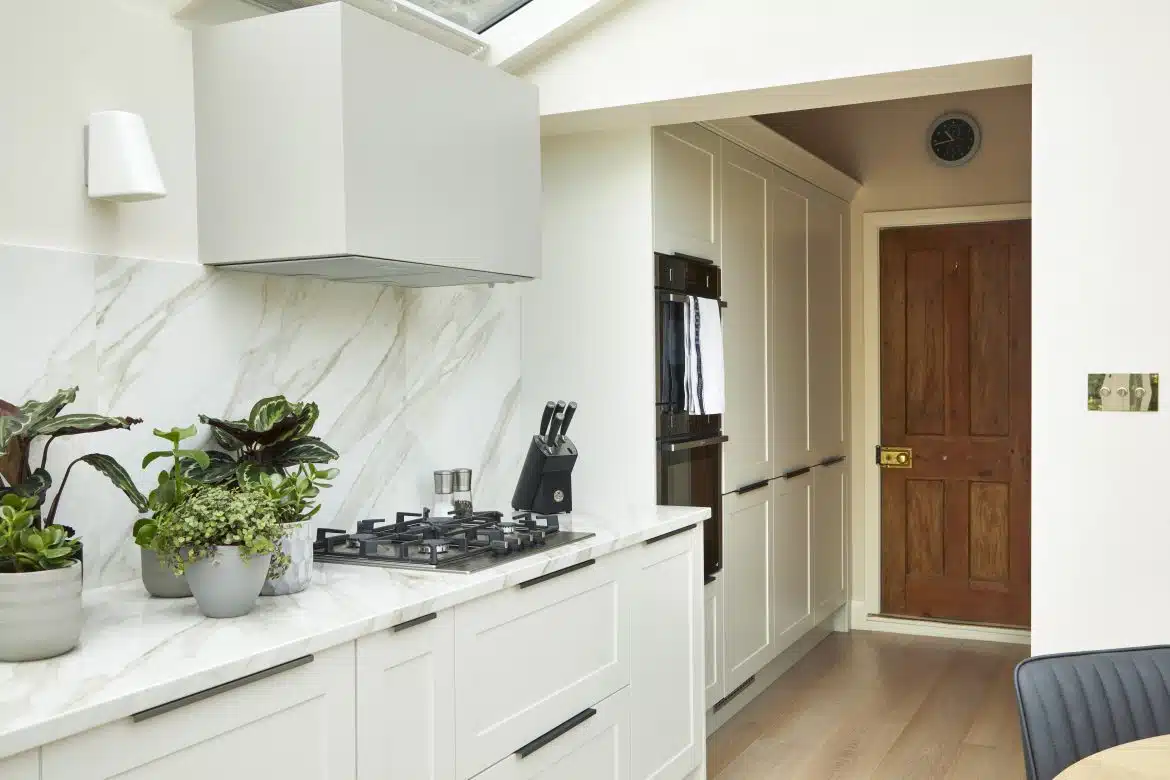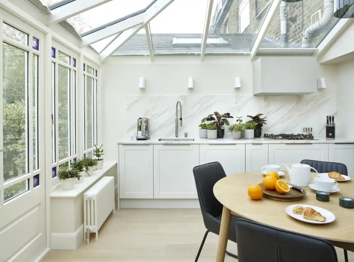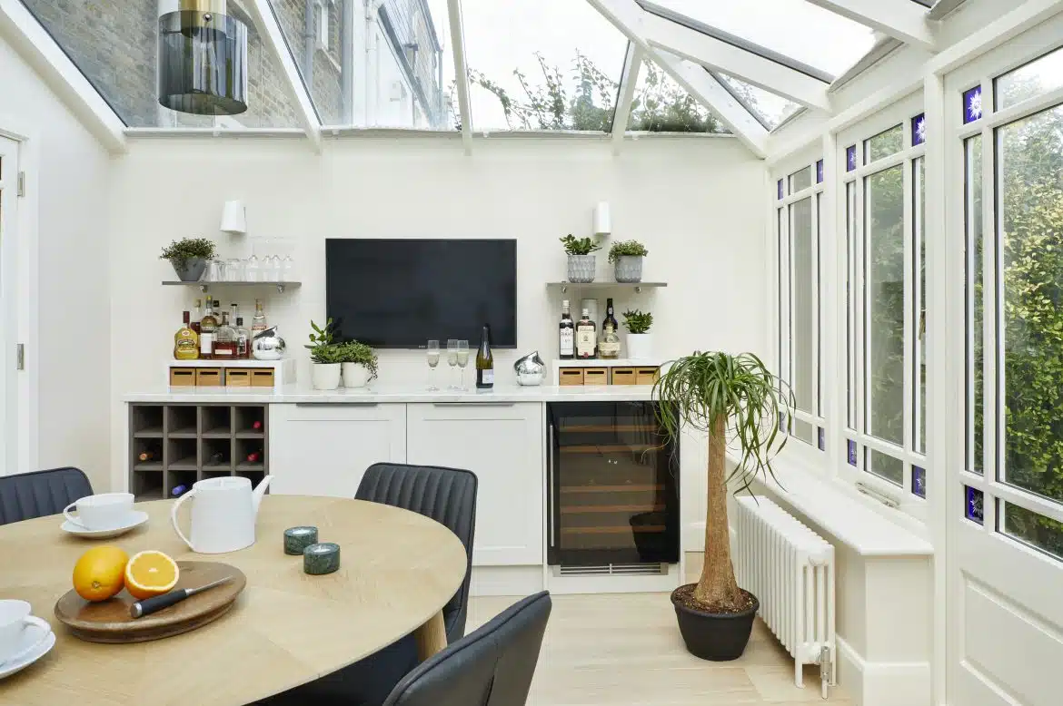 This period terraced home has been renovated in several stages since 2019. The owner, a busy lawyer, first wanted to refurbish the Kitchen Diner located in the conservatory. It needed to work well with the conservatory structure and not compete heavily with the garden views. A colour palette of pale, warm neutrals allows copious light to work to its best advantage. Meanwhile, modern kitchen cabinetry has understated impact, with the expanse of stone worktop being the major, contemporary flourish.