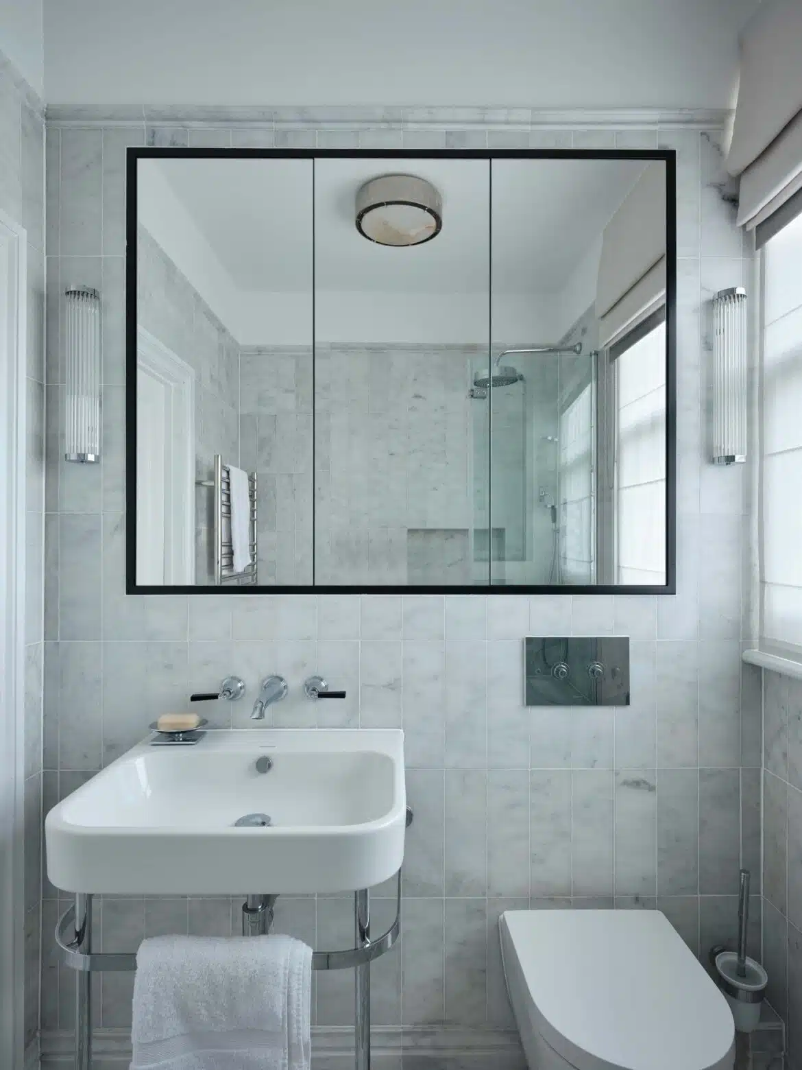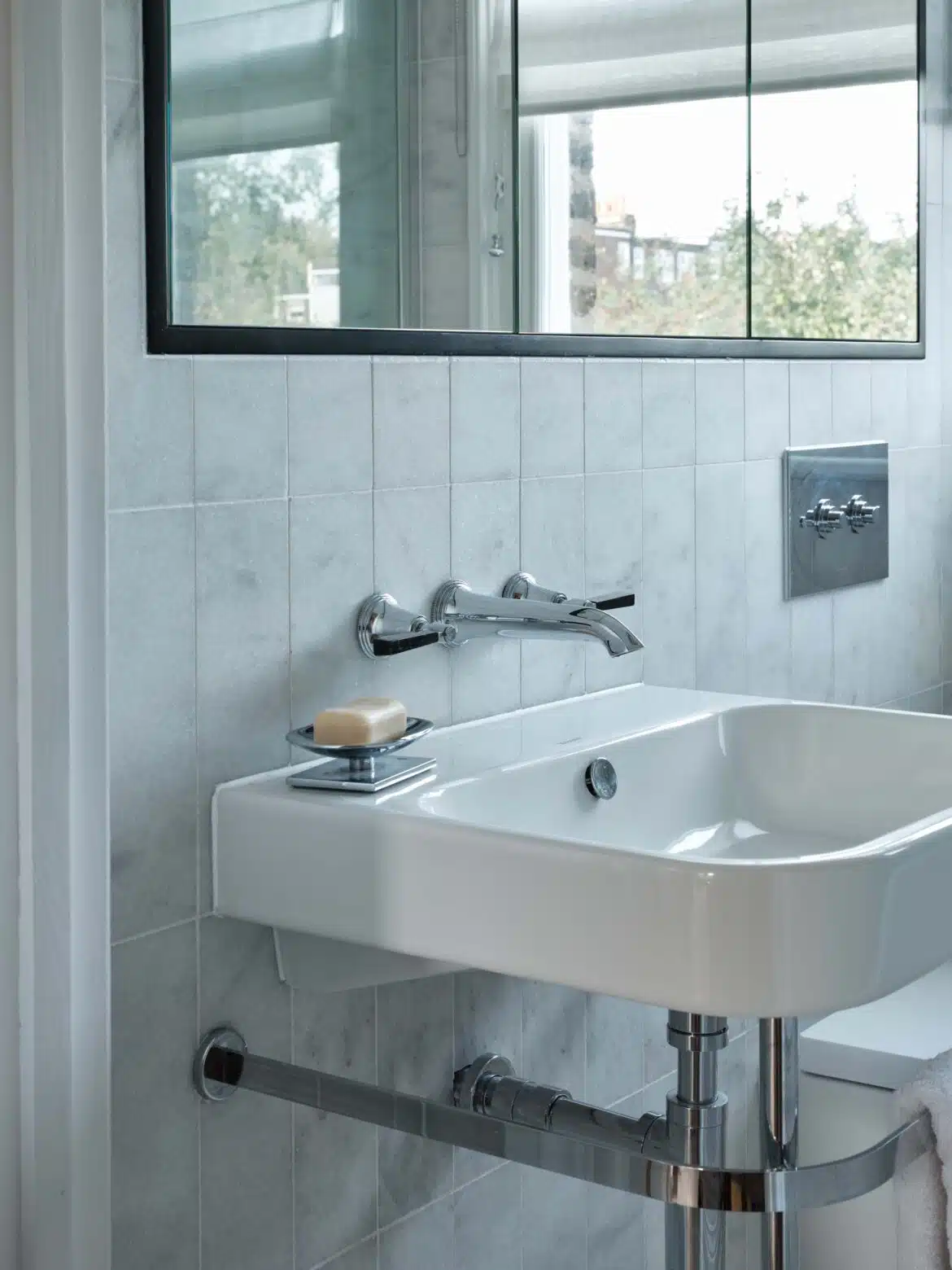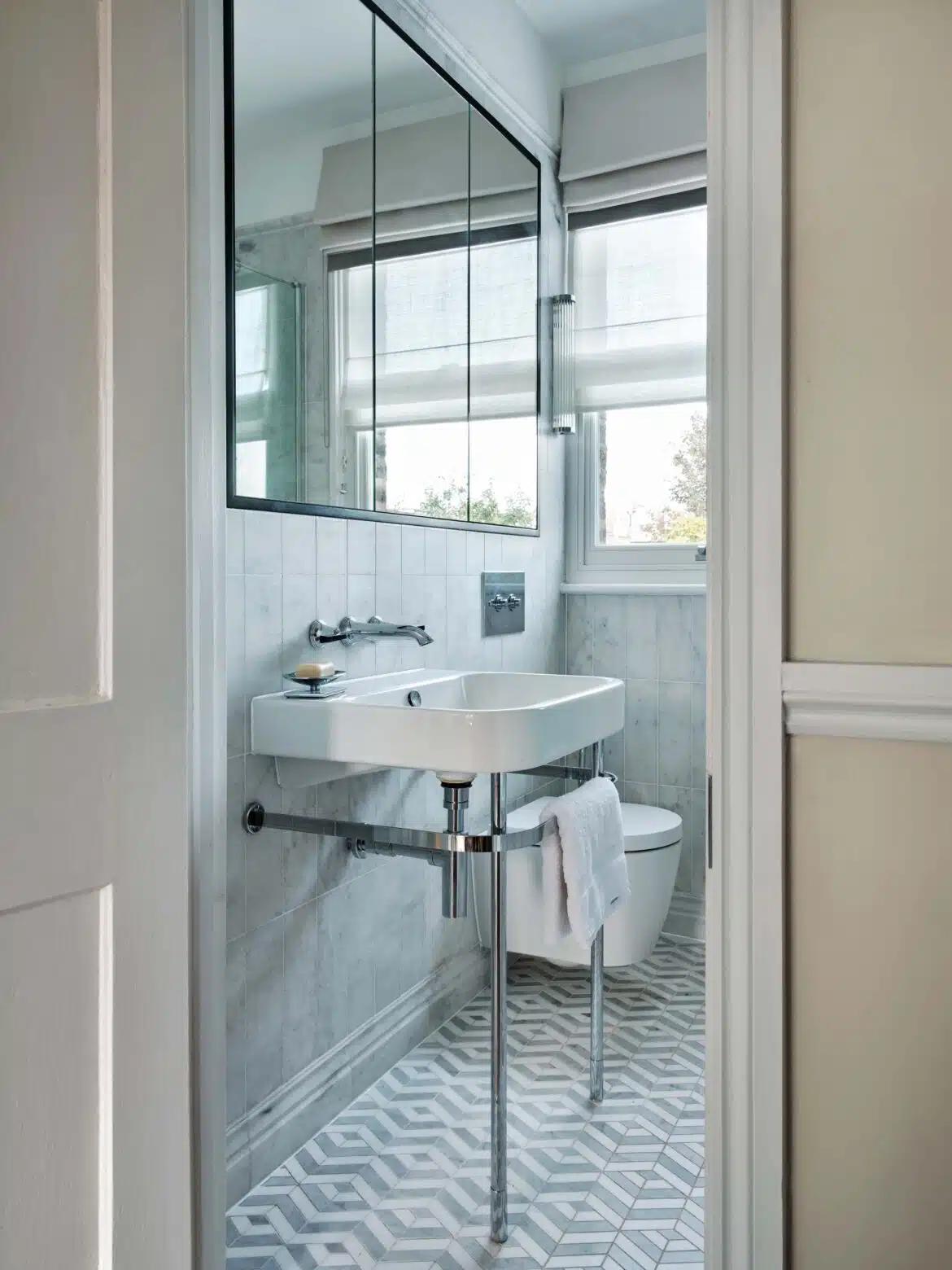 The family bathroom called for an update next. Being compact, some smart solutions were required to maximise space. Read more here. We elevated the room with beautiful, stone tiles in unexpected patterns as well as classic modern brassware with sharp details.