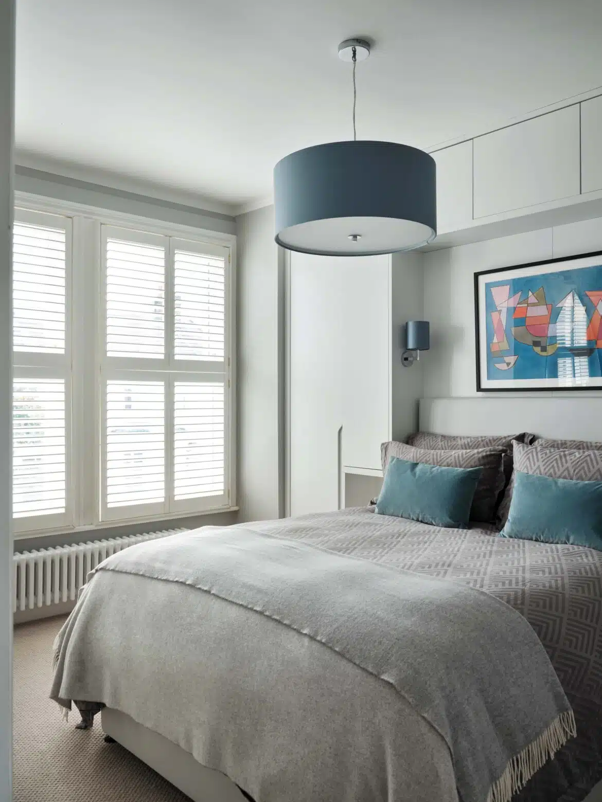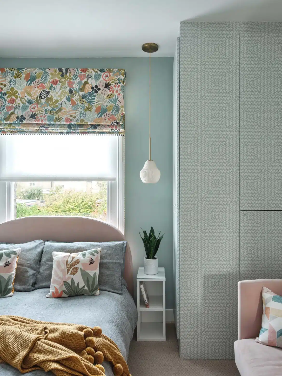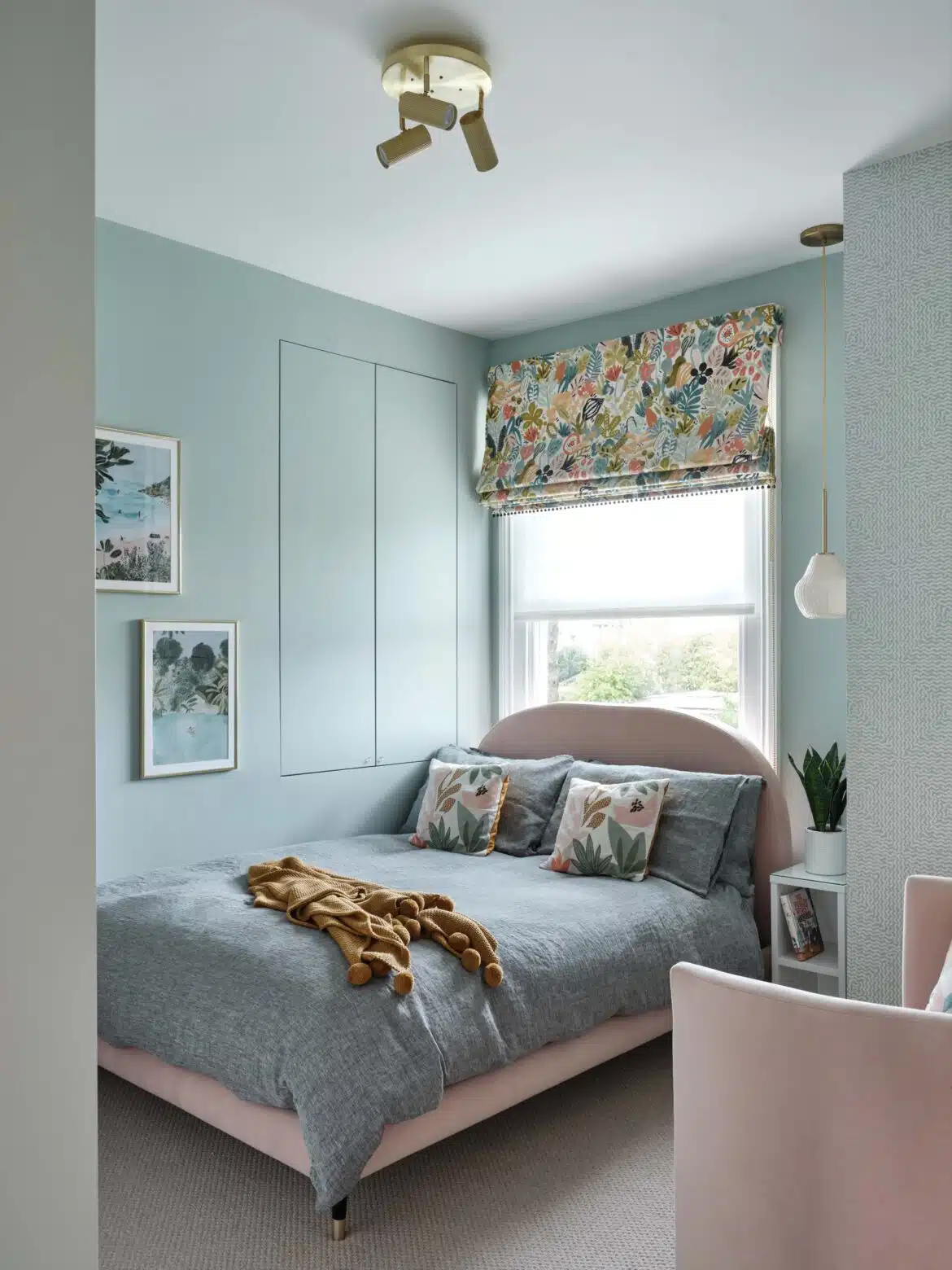 More recently, we refurbished the first floor bedrooms. In both rooms, possibilities were opened up by re-thinking the chimney breast and alcove walls. The Master Bedroom was treated to built-in storage, while the bed became the focal point. The client’s “tweenage” daughter needed her room to fulfil several functions, so space planning was paramount. Dynamic use of colour, vibrant pattern, and trendy detailing completed the picture.