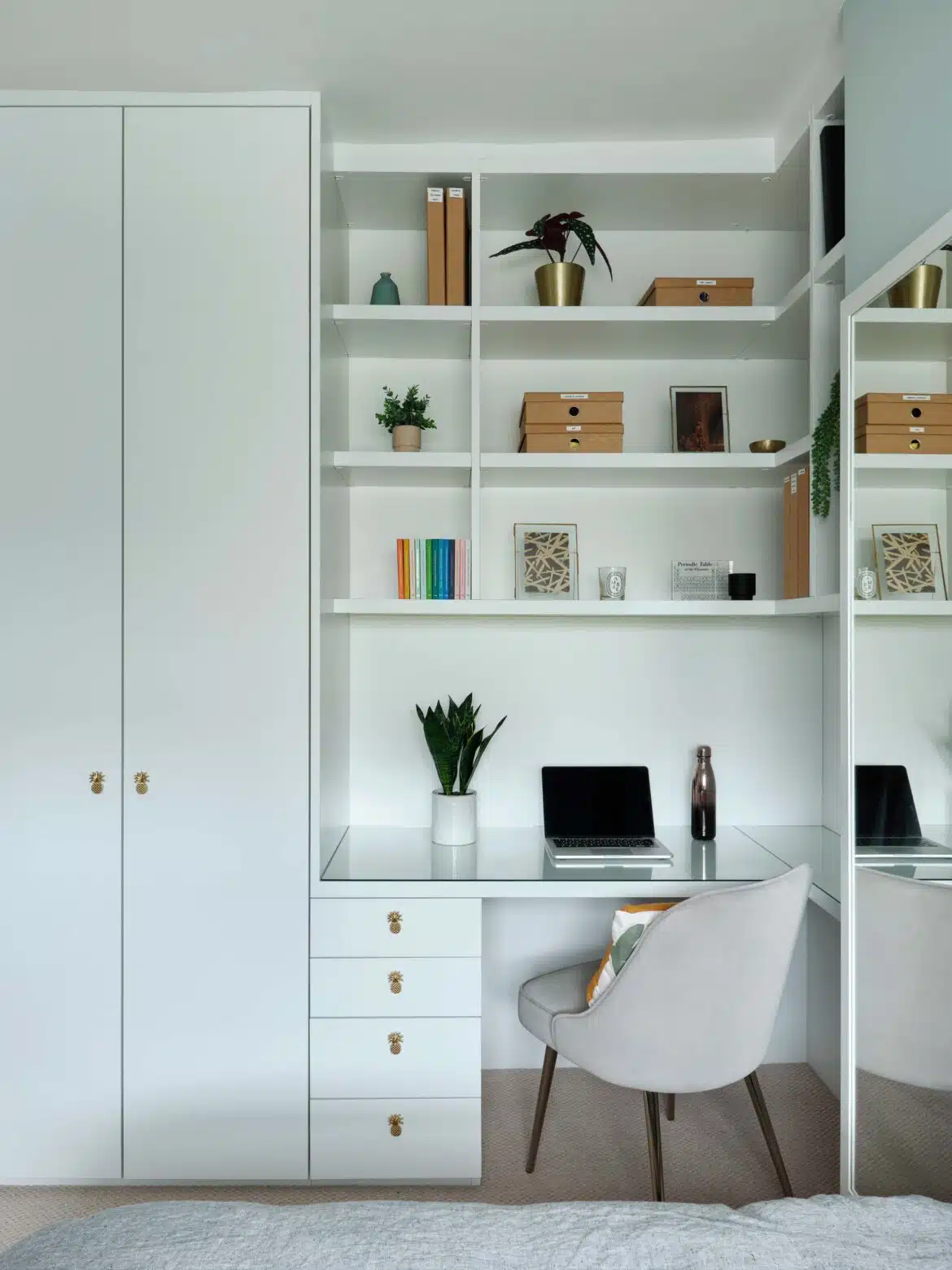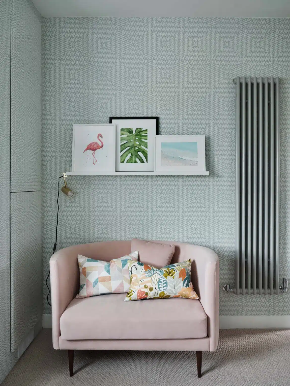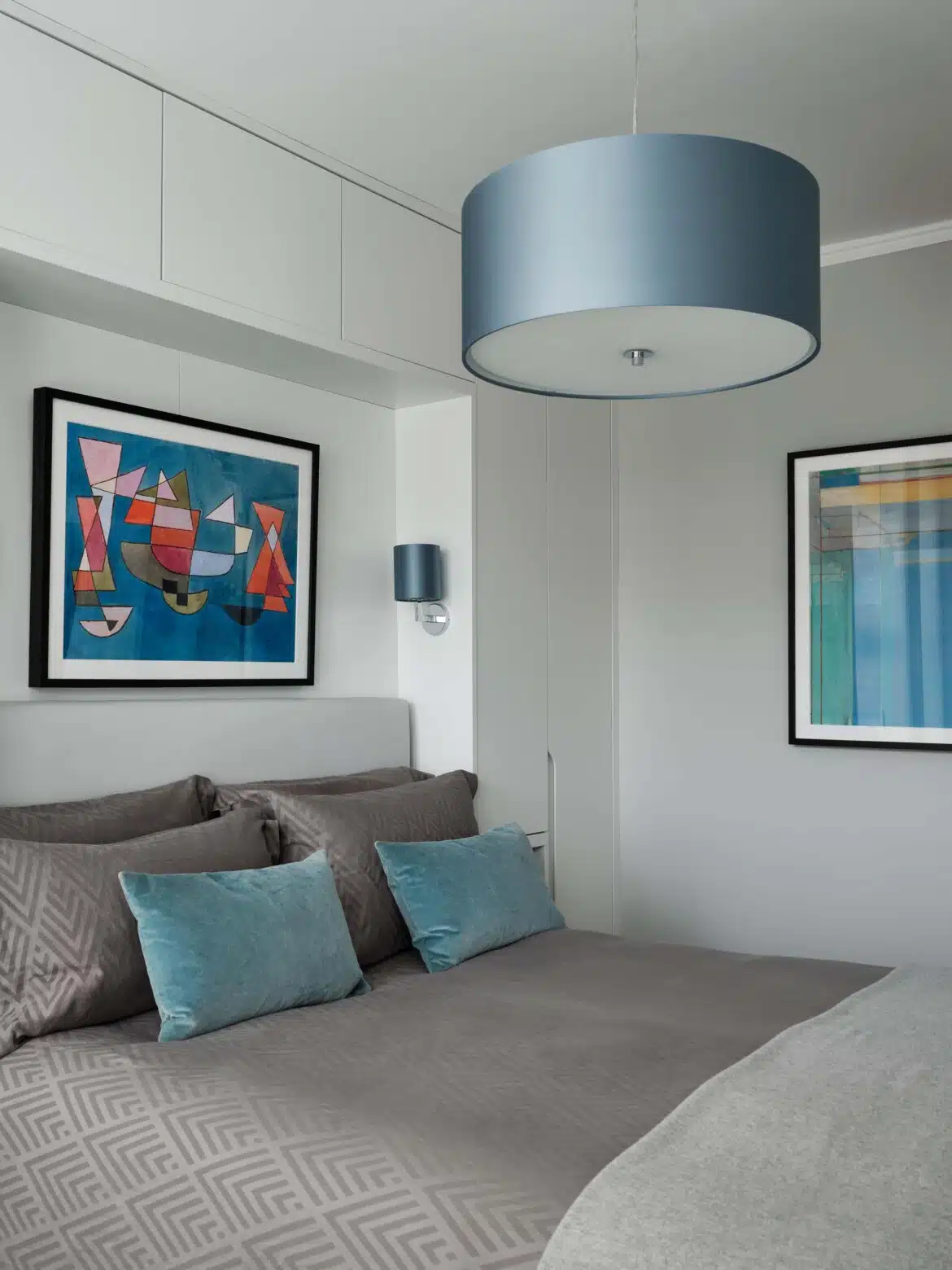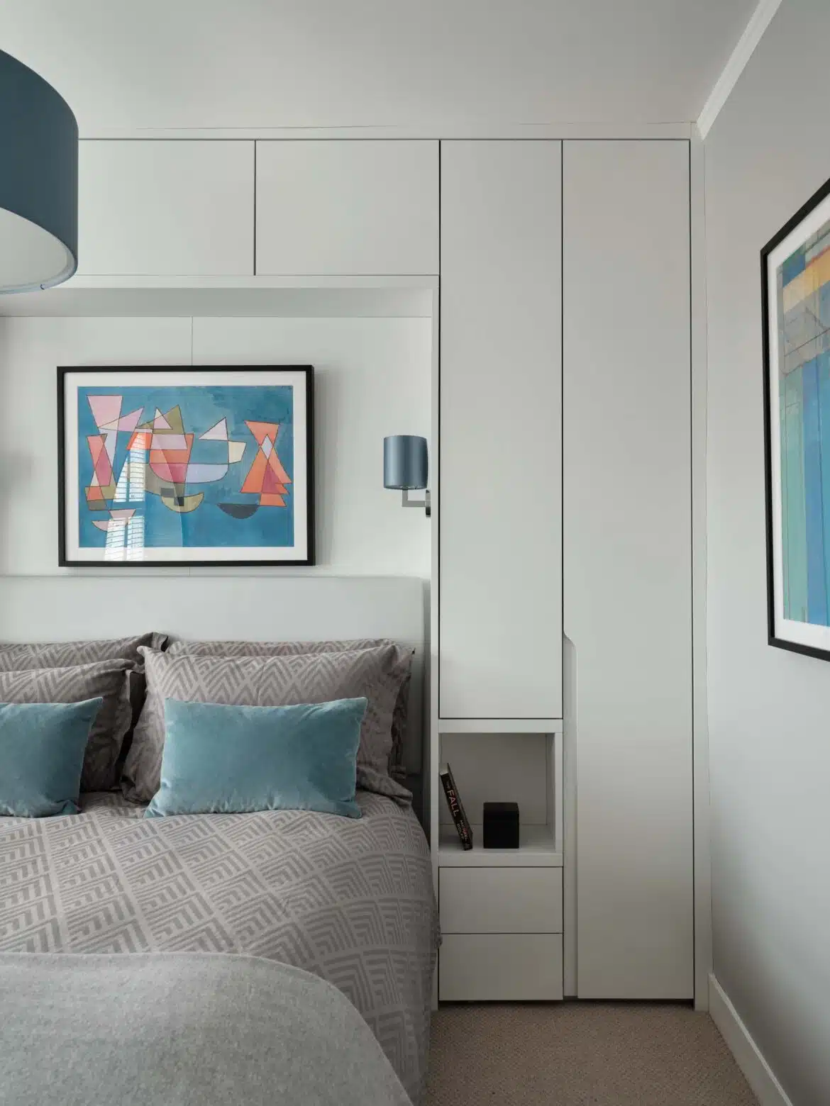 More recently, we refurbished the first floor bedrooms. In both rooms, possibilities were opened up by re-thinking the chimney breast and alcove walls. The Master Bedroom was treated to built-in storage, while the bed became the focal point. The client’s “tweenage” daughter needed her room to fulfil several functions, so space planning was paramount. Dynamic use of colour, vibrant pattern, and trendy detailing completed the picture.